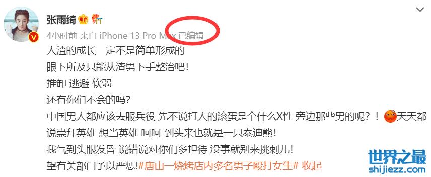 就在大家的热议中,张雨绮或许也觉得自己的发言有些不对,她编辑了该动态,将有关战狼的发言删掉,但就围观男性的言论并没有删掉,随着网友的热议,目前她已删除了为唐山打人事件的发声博文,或许张雨绮的本意并非是想搞对立,她只是想让更多的男人在看到女人被欺负时,被殴打时,能够伸出正义之手。