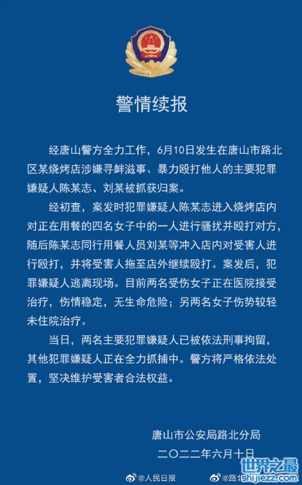 视频公开后,这起严重的打人事件很快在网络上迅速传播,唐山警方也发出正式通报,已抓获两名犯罪嫌疑人,其他犯罪嫌疑人正在全力抓捕中,官方媒体就该事件也连续发声。