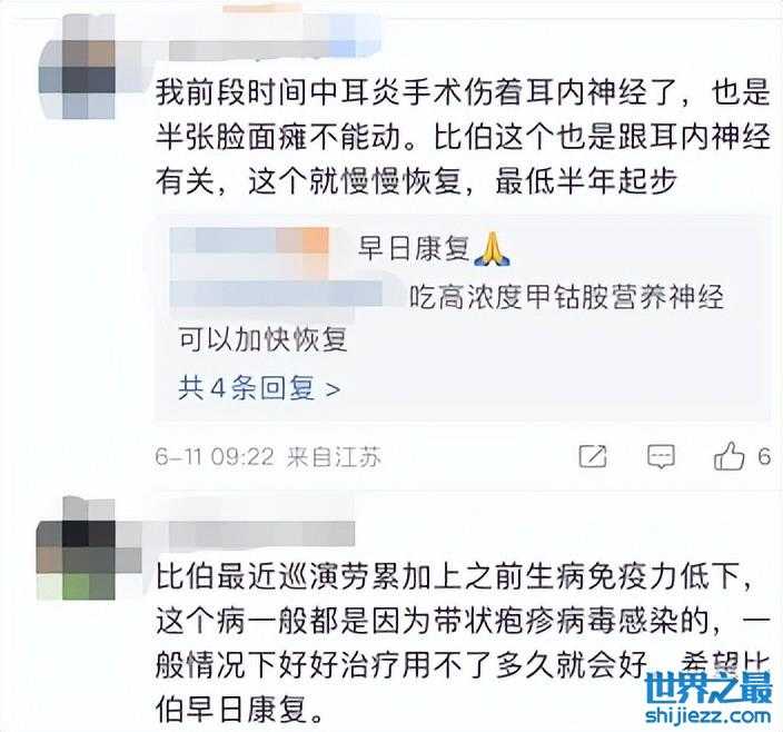 在看到此消息之后,网友们纷纷提出自己的建议,还说起自己曾经面瘫的经历,表示这个病症与耳内神经有关,但只能慢慢恢复,也有网友指出这种病症的原因是免疫力低下,是病毒所感染。从网友们的评论中我们感受到大家都希望贾斯汀比伯能尽快好起来。