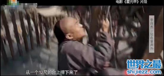最惊险的是拍摄《霍元甲》时,从12尺(相当于四层楼)的高台跌落,虽然跌落在草坪上,没有受很重的外伤,但也受到了震荡和内伤,也就是这伤差点让李连杰丢命。