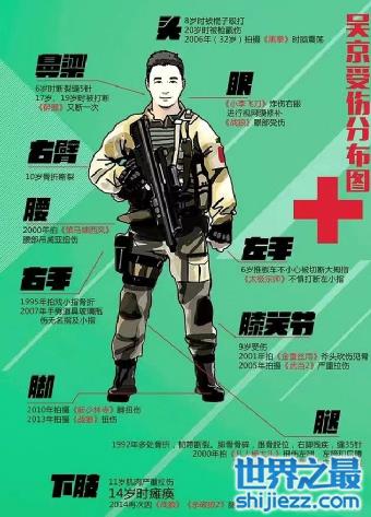网友因此还给吴京做了一张全身伤病的汇总图,图上最瞩目的就是全身缝针达到100多,还有各种大大小小的其他受伤经历。