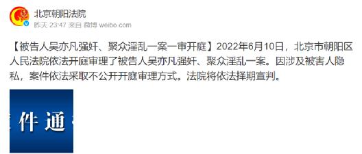 而今天发生的大事件除此之外,还有大家关注已久的”吴某凡“案件也有了最新的进展,6月10日,北京市朝阳区人民法院依法开庭审理了被告人吴某凡强奸、聚众淫乱一案。但因涉及被害人隐私,案件依法采取不公开开庭审理方式,择期之后法院也将进行宣判。