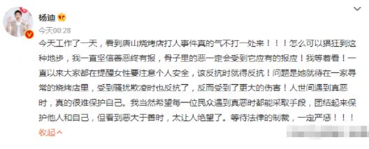 男星杨迪在结束自己工作看到新闻之后,立马发布一则长文来表述自己的感受,希望可以早日让那些恶人受到惩罚,也为受害者鸣冤,明明他只是在一个再寻常不过的夜晚吃个烧烤而已,就受到了这样的骚扰欺凌,让人气愤!