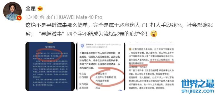 金星第二次发声则科普了事件的严重性,她还从网络上找到相关的惩罚,她重点强调这绝不是寻衅滋事那么简单,完全属于恶意伤人了,打人手段残忍,社会影响恶劣,“寻衅滋事”四个字也不能成为流氓恶霸的庇护伞。