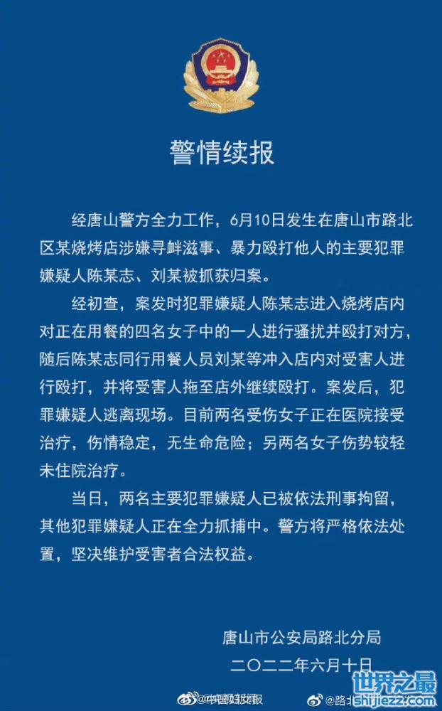 6月10日,唐山打人事件在网络上疯传后引起全国人民的高度关注,据报道,该事件发生在10日凌晨2点多,几名女生在烧烤店用餐时,疑遭到了陌生男子的调戏,女生制止对方的行为后遭到该男子暴打,随后女生的好友上前帮忙,结果与该男生一起吃饭的另外几个男生对这几位女生拳打脚踢,每一拳、每一脚都照死的打,从屋内拽着头发拖到屋外打,很快几位女生被打的无法站立,画面相当可怕。