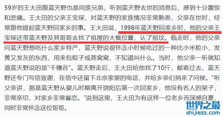 另外,村支书还向媒体记者透露了蓝天野祖宅的位置,另一个同族兄弟对蓝天野的家族情况非常熟悉,透露蓝天野曾在1998年和哥哥一起回家乡找了祖屋,那也是蓝天野从婴儿时期离开饶阳第一次回家乡,没有名人架子非常亲切,蓝天野对家乡也很眷恋。