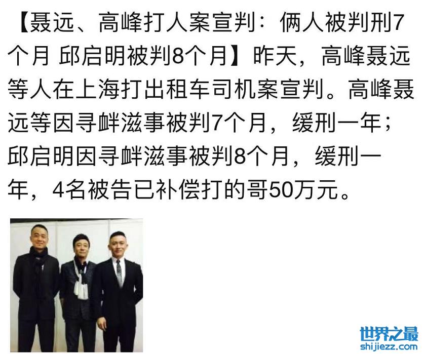 最终因为此事,高峰聂远等人因为寻衅滋事被判处有期徒刑7个月,缓期一年执行,而邱启明则因为相同罪名被判处8个月,同样缓期一年执行,此外,出租车司机获得了50万的医疗费用与精神损失费。