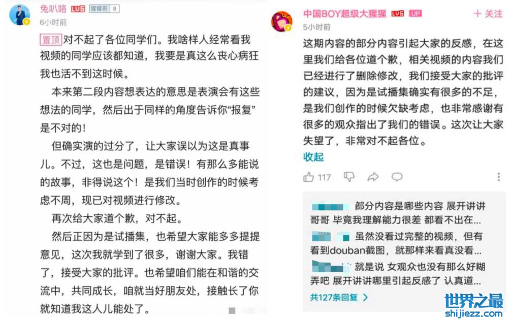 视频引起争议之后,二人在评论区潦草道歉说是演得过分了,创作的时候欠缺考虑,现已对原视频进行修改。追女孩不成功就想着去报复去诋毁,作为一个这么大的up主,这样的玩梗真的没有意思。