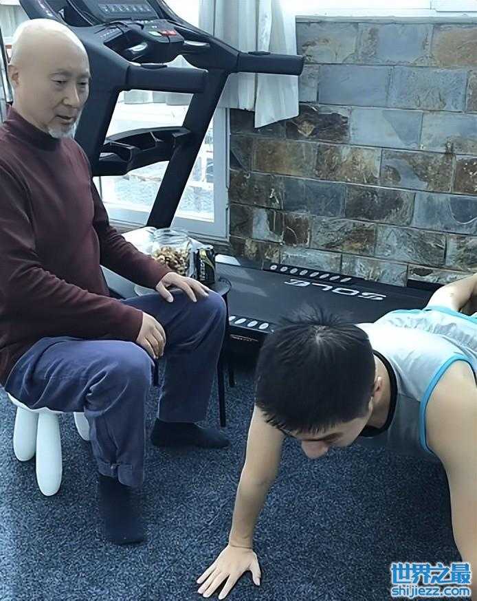 在陈佩斯的社交平台上,他经常分享与儿子的有趣日常。这段视频中便是陈佩斯督促儿子健身的画面,只见他坐在凳子上一脸严厉,陈大愚穿着健身服费力地趴在地下做着俯卧撑,而更引人注目的是一旁跑步机上一大桶巧克力,场面很是有趣。