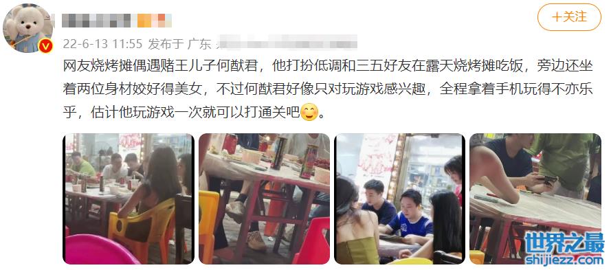 在吃饭中,何猷君还拿着手机打游戏,游玩过程中还时不时与对面的美女交谈着,不过,仅从视频看,何猷君身边还有多位男友人,何猷君大部分时间都是在和男友人聊天,偶遇者也透露何猷君好像只对打游戏感兴趣,和这几位美女也没有过多的交涉,而且大家吃烧烤也都是喝的饮料,就是很正常的饭局。