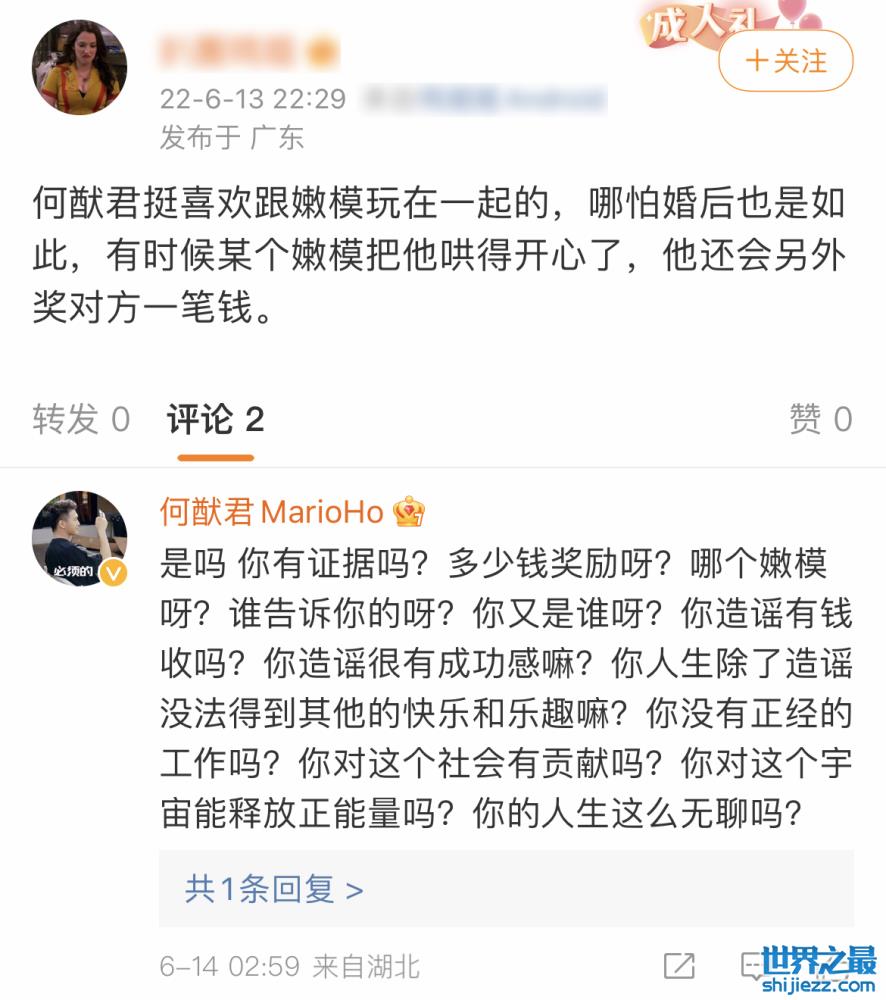 然而这个爆料发出去没几个小时,何猷君本人火速辟谣,他12问对方“是吗你有证据吗?多少钱奖励呀?哪个嫩模呀?谁告诉你的呀?你又是谁呀?造谣有钱收吗?你造谣很有成就感吗?你人生除了造谣没法得到其他的快乐和乐趣吗?你没有正经的工作吗?你对这个社会有贡献吗?你对这个宇宙释放正能量吗?你的人生这么无聊吗?”