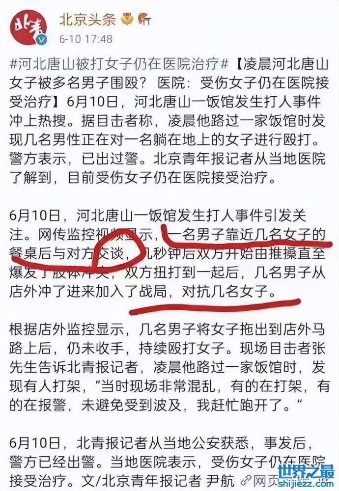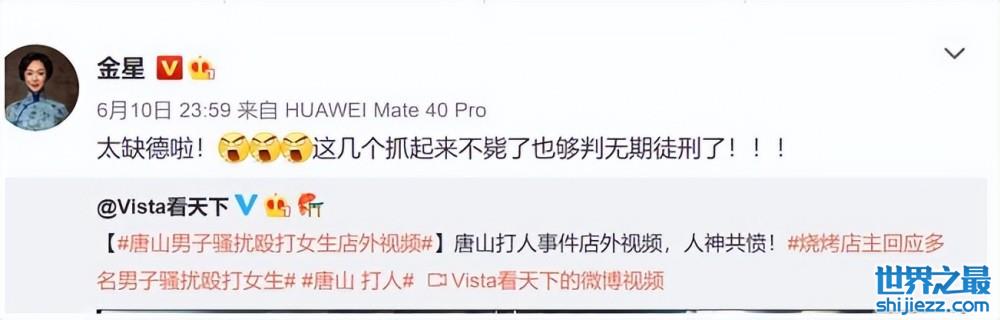 时间线拉到唐山事件发生的最初阶段,在6月10日事发之后,金星老师第一时间转发原视频,然后发文:太缺D啦!这几个抓起来不毙了也够判无期徒刑了!