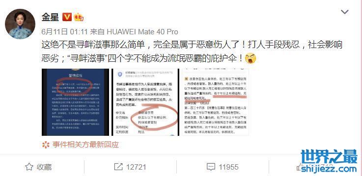 6月11日,事发的第二天金星老师第二次发言:这绝不是寻衅滋事那么简单,完全是属于恶意伤人了!打人手段残忍,社会影响恶劣;“寻衅滋事”四个字不能成为流氓恶霸的庇护伞!