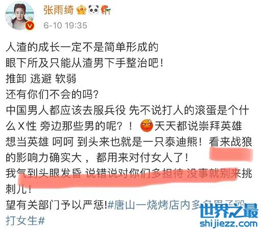 脾气火爆的张雨绮,是为唐山打人事件最先发声的明星之一,这位娱乐圈第一勇姐,却在发文后被骂到删动态。
