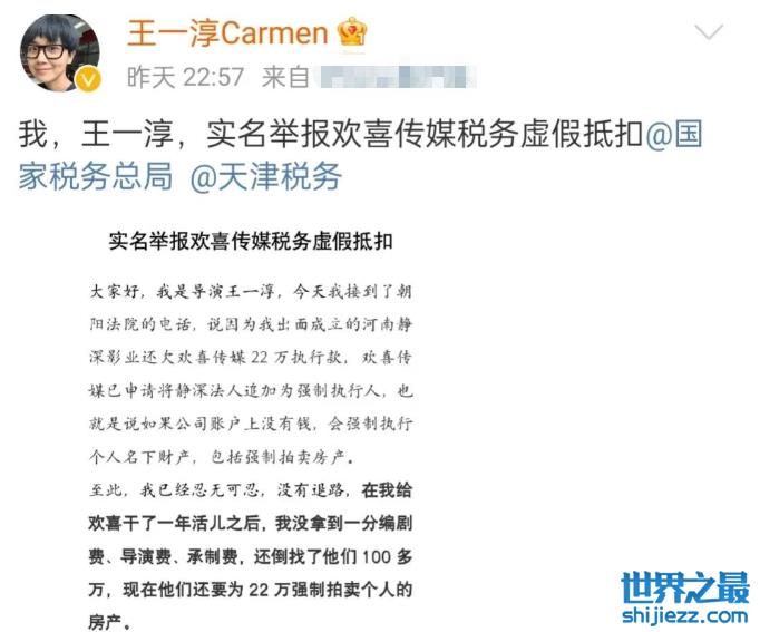 6月13日晚间,女导演王一淳发文,称自己实名举报宁浩、徐峥等人创办的欢喜传媒有税务虚假抵扣的现象。