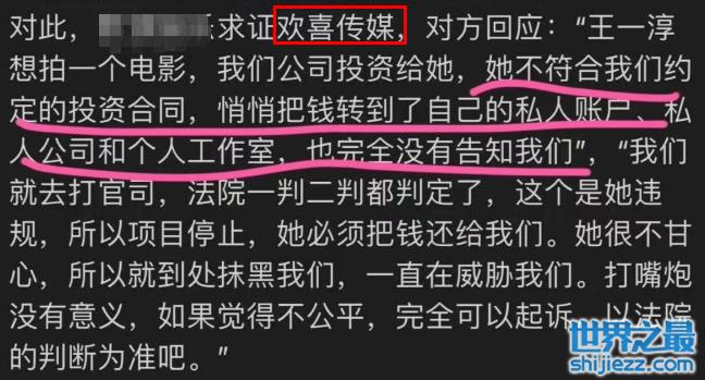欢喜传媒也很快回应:王一淳不按协议规定执行,将相关款项转移到了个人账户或者个人工作室。我方要回投资款后她很不甘心,到处抹黑我们,一直在威胁我们。