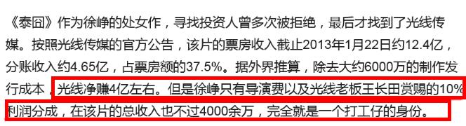 《泰囧》大获成功之后,徐峥又拍了《港囧》。这次他就摇身一变成了大老板,拿下了47.5%的票房占比。随后,他就将这47.5%以1.5亿元的价格卖给了香港公司,并当了该公司的股东。