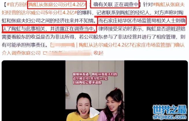 不说其他公司的进账,仅跟张庭合作了5年,陶虹就得到了股东分红的4.2亿。而且在张庭出事前一年,陶虹就退股了。
