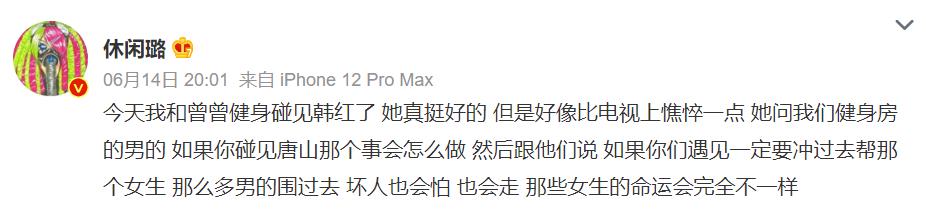 6月14日,知名博主与友人去健身房运动之际恰好偶遇韩红,在健身房中,韩红还特意询问在场的所有男性,如果遇到唐山打人事件那种情况自己会怎么做,而后韩红也顺势表达了自己的观点,表示如果身为男性遇到这种情形一定不能袖手旁观,大家一起围过去帮忙,坏人也会胆怯,因为大家的勇敢出头,这些身处危险的女生命运肯定会完全不一样。