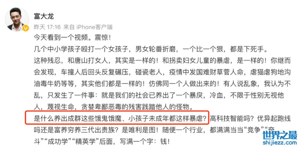 几天过去,大众虽然一直保持对唐山的关注,但是发声的明星越来越少。稀奇的是,一直低调、从未对热点事件点评的影帝富大龙,竟然发出千字长文,对唐山打人事件进行控诉,可见他也愤怒至极了。