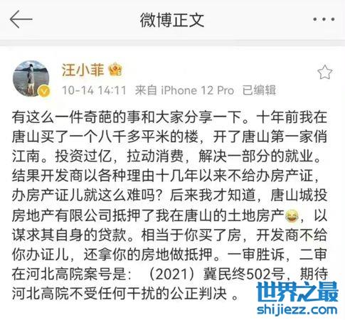 据悉,去年10月份,汪小菲曾更新过一条动态,分享了自己十年前在唐山买房置业遭遇的不愉快经历,汪小菲在文中提到,自己2011年在唐山买下了一栋面积为8000多平的楼,结果被开放商恶意拖欠房产证十余年之久。