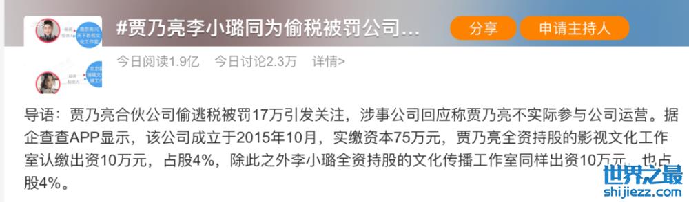 起因是“贾乃亮李小璐同为偷税被罚公司的股东”上了热搜,意思是某家公司偷税漏税被罚了,贾乃亮、李小璐都在该公司有持股。
