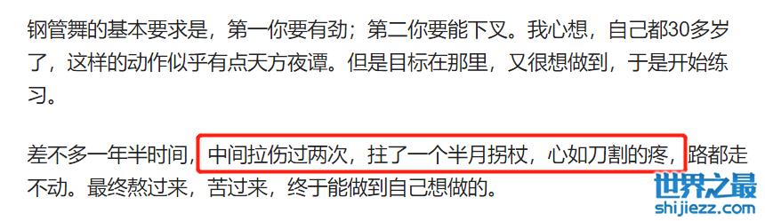 后来她被开导意识到运动的重要性,从而选择了去学跳钢管舞,还曾两度受伤,甚至需要拄拐杖。