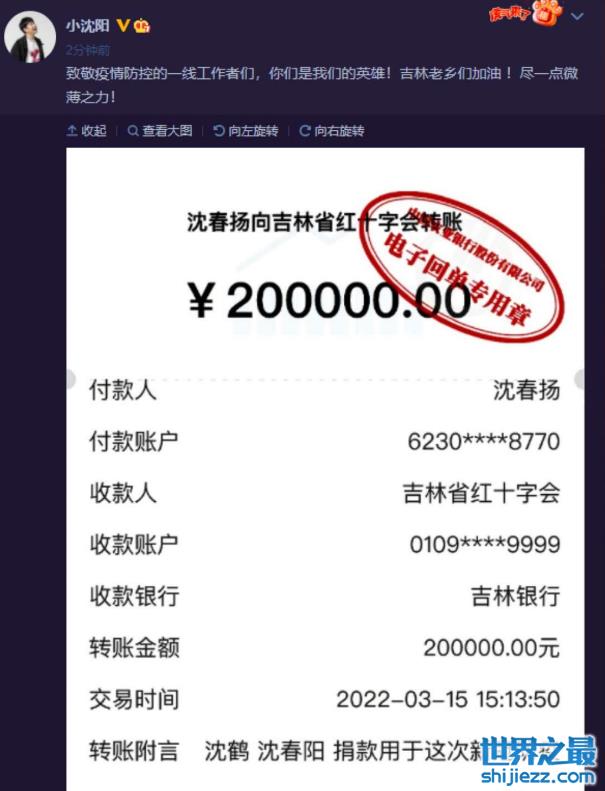 前不久,小沈阳夫妇还捐款20万支持家乡吉林抗疫。