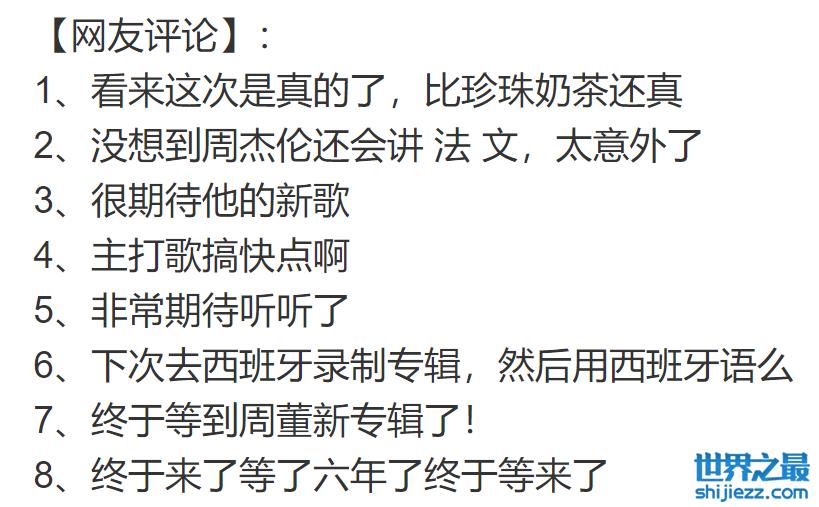 还有网友开玩笑说:“看来这次是真的了,比珍珠奶茶还真”“没想到周杰伦还会讲法文,太意外了,下次去西班牙录制专辑,然后用西班牙语么?”“没想到在我退休之前周杰伦出专辑了”