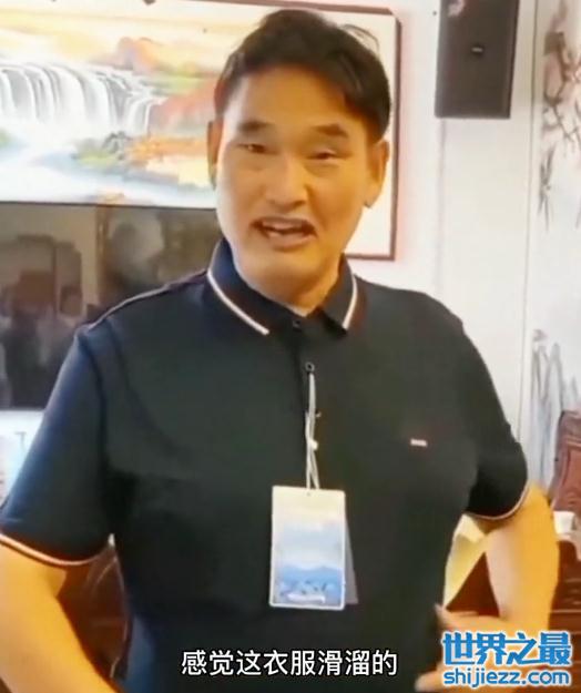 穿上衣服的大衣哥说:衣服滑溜的,特别的舒服,面料也非常的透气,好啊,太好了。