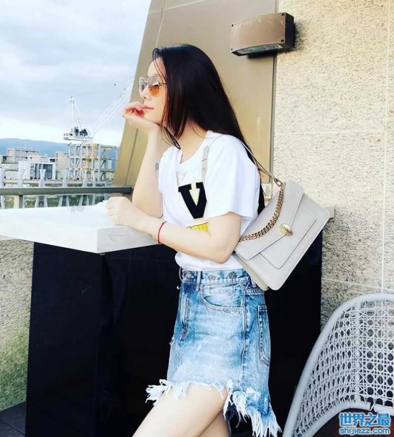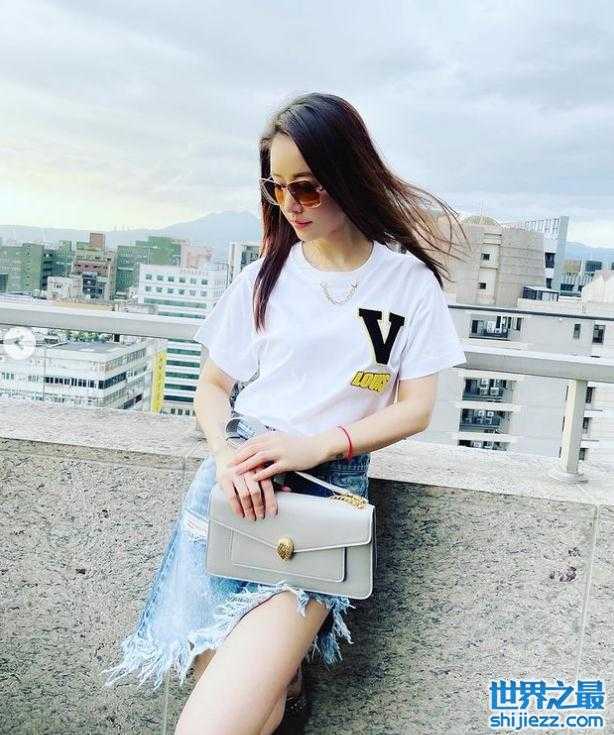 左手提着小包包,应该是她比较喜欢的一个新款式吧。右手靠在楼顶的护栏边上,姐姐这造型完全不像是已经46岁的女人了。