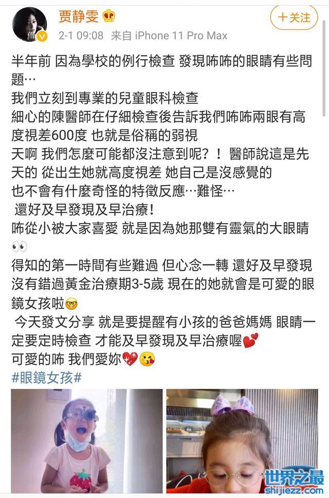 不过在2021年初,贾静雯发文爆出咘咘被确诊为高度近视,两只眼睛有600度的视差,也就是俗称的弱视,并称幸好没错过矫正的黄金期,所以咘咘现在一直要佩戴眼镜,变成了眼镜女孩。