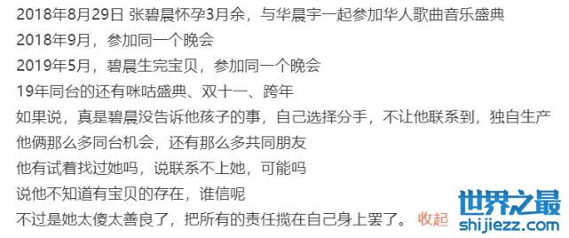 有网友列出了详细的事实来佐证,据悉,2018年8月和9月24日,张碧晨与华晨宇一起参加了音乐盛典和同一个晚会,两人的节目还是紧挨着的,此时张碧晨怀孕已3个多月。