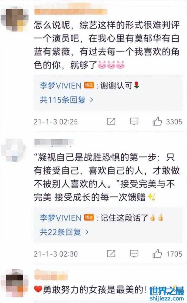 随后一众网友也表示对李梦的支持与包容,表示“凝视自己是战胜恐惧的第一步:只有接受自己、喜欢自己的人,才敢做不被别人喜欢的人。”接受完美与不完美,接受成长的每一次馈赠,而李梦也是很亲和地回应了网友表示自己“记住这段话了”。