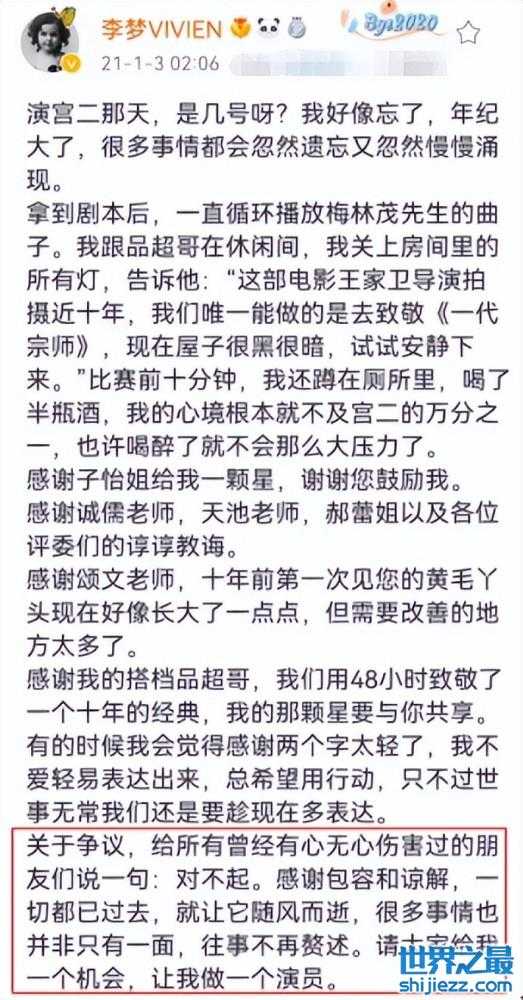 但事实并非如此,事后,李梦在个人社交平台发布文章解释,首先她感谢了一路以来包容并帮助他的人,其次回应了争议,为有心与无心伤害他人而道歉,并不希望大家过分追究,只是想做好演员的本职工作,用更好的作品来回馈大家。