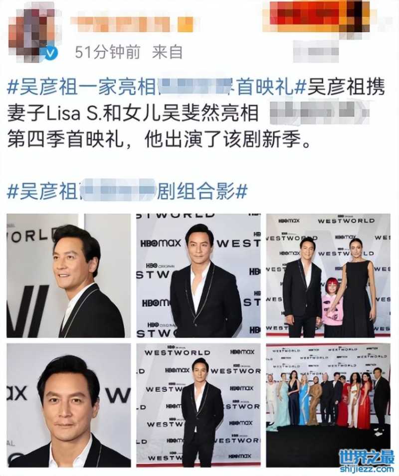 近日,有媒体爆料出吴彦祖带全家人一起亮相某电影首映礼。吴彦祖和妻子Lisa S.一起携手9岁混血女儿吴斐然走红毯拍照,女儿挑染红发惹人注目。
