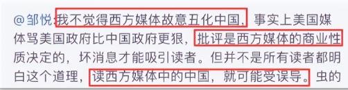 在遭到网友怒骂后,邹悦先是为自己辩解,称自己同意西方媒体有偏见,但偏见不等同于恶意。