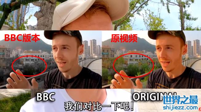 英国博主杰森在中国拍摄了一段视频,可BBC在引用他的视频时,又在上面加上了一层滤镜,把绿色的树都P成灰色了。