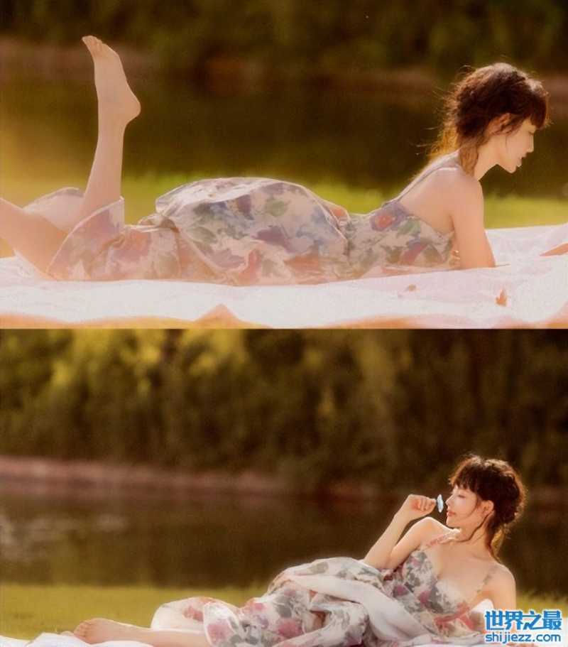接着,张嘉倪趴在草丛中,她曲线曼妙,一条腿微微抬起,画面中的光打得十分自然,远处的湖水安静,树林幽静。张嘉倪拿起一朵小花在鼻子前嗅着,单手撑在草地上,晕染类的裙子非常复古,这样一幅画面美到极致。