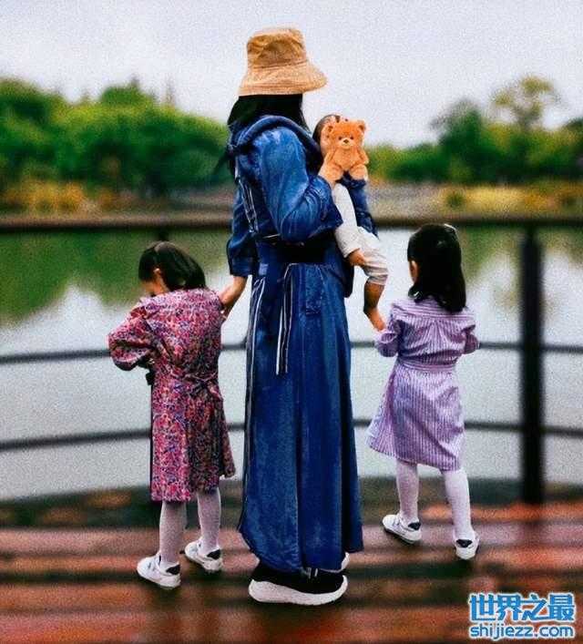 在生下小咘芽之后,谢娜也常常会带三个女儿出去玩耍,这张照片中谢娜穿着一身牛仔裙,怀中抱着小咘芽,跳跳和俏俏一左一右站在妈妈身旁,母女四人温馨有爱。