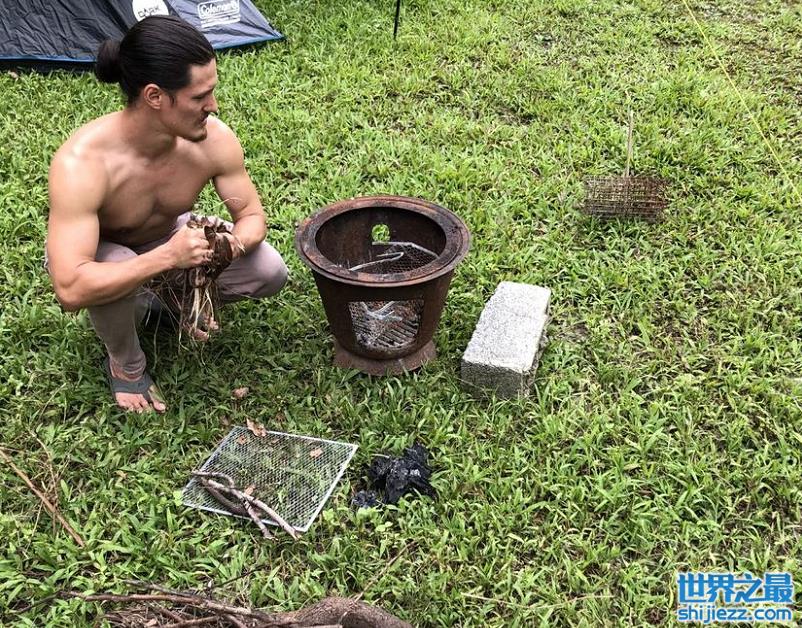 照片中,周厚安赤裸着上身,下身简单穿着一条卡其色长裤,身体蹲着,表情用力,手里正在捏着杂草,似乎在准备野外生火。由于正在用劲,这显得周厚安手臂肌肉十分明显,肱二头肌突出,胸肌也十分大块,周围野外的杂草也为他增添了几分野性。