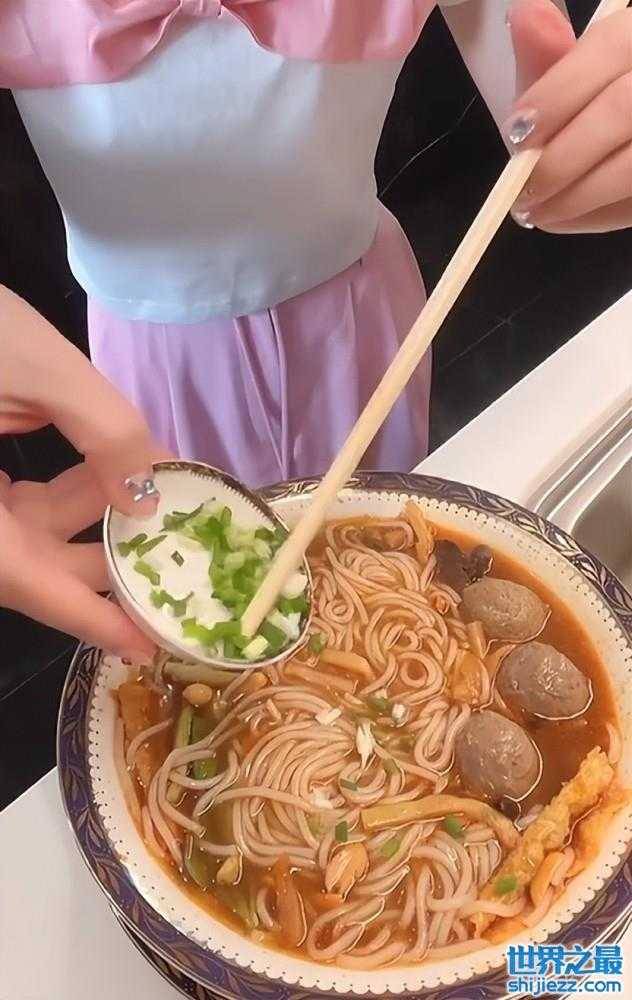 在煮好之后,方媛拿出一碟葱蒜放进了螺蛳粉内,并在螺蛳粉内加了很多牛肉丸之类的美食,看得出来方媛当日胃口很好。