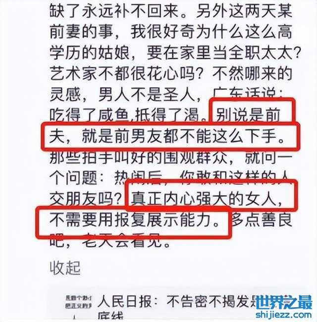 “这么高学历为啥当全职太太,艺术家不都很花心吗?别说是前夫,前男友都不能这么报复,内心强大的女人不需要用报复展示自己的能力。”