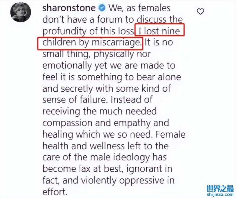 近日,好莱坞知名女星莎朗斯通为安慰一名不幸流产的拉丁舞者兼演员Peta Murgatroyd,在评论区留言揭露自己因为流产失去九个孩子的心酸过往。