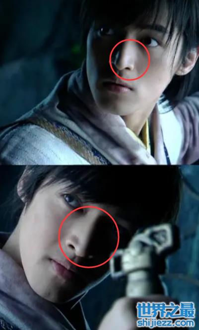 而霍建华的鼻子主要是向右有点歪,并不是垂直向下的,虽然鼻梁还算挺拔,但怼脸仔细看,这个bug就挺明显了。