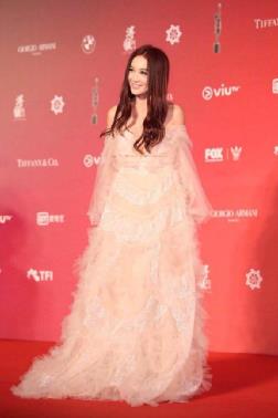 红毯上的钟丽缇穿过深V露肩礼服,丝滑材质勾勒出钟丽缇的身材,即使看起来略显臃肿,也依然将性感贯彻到底;