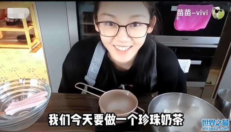 接着,苗苗晒出了自己做珍珠奶茶的视频,画面中的她素颜出镜,带着黑框眼镜,打扮十分低调随意,也很居家。苗苗身前戴着围裙,面带笑容地看着镜头给大家介绍珍珠奶茶的制作过程。在她的面前,放着各种食材,从这段视频中也能看出苗苗的敢于尝试。