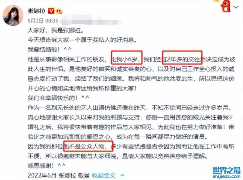 其实在结婚前,张娜拉便主动在自己的社交平台上官宣了即将结婚的消息,透露对方比自己小6岁,从事摄影工作,并且不是圈内人,字里行间表达着欣喜,并且言辞恳切,想得到大家的祝福。