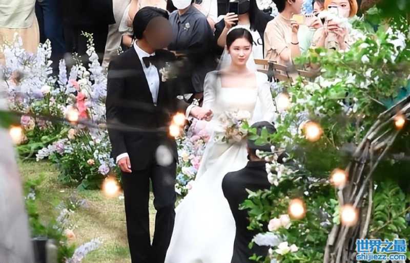 在走红毯时,张娜拉一袭白色婚纱,头饰美丽动人,她锁骨精致,一旁的丈夫穿着西装,夫妻俩手挽着手,看得出十分幸福。婚礼在一个露天花园中举办,花朵绽放,仿佛也在恭喜张娜拉结婚的喜讯。
