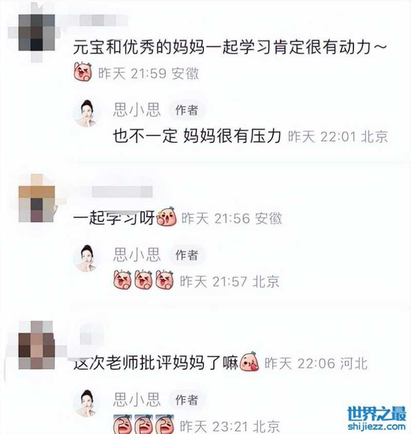在看到李思思晒出的这张照片后,大家纷纷评论元宝和优秀的妈妈一起学习,肯定很有动力,李思思俏皮回复到自己很有压力;还有网友表示这次老师有没有批评妈妈,李思思回复了三个笑哭的表情,看起来很是无奈。